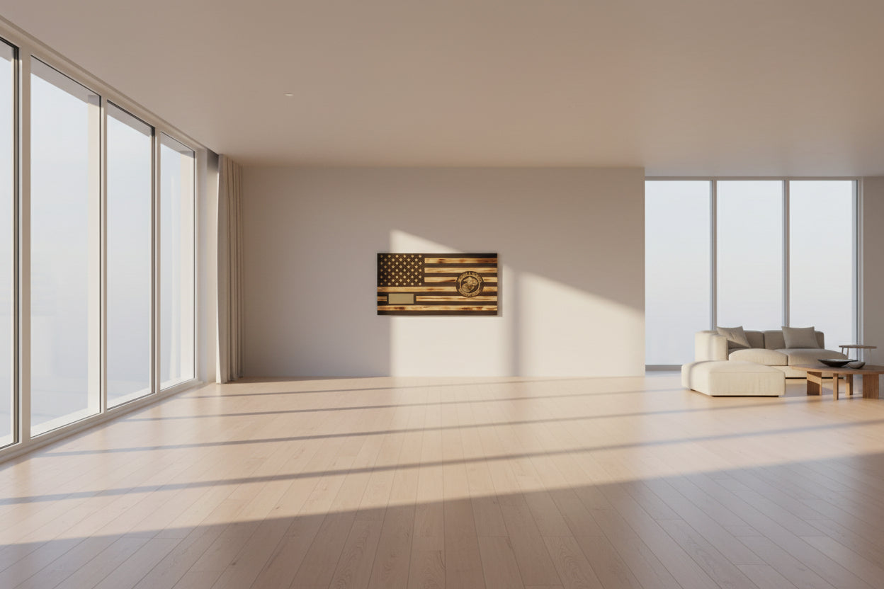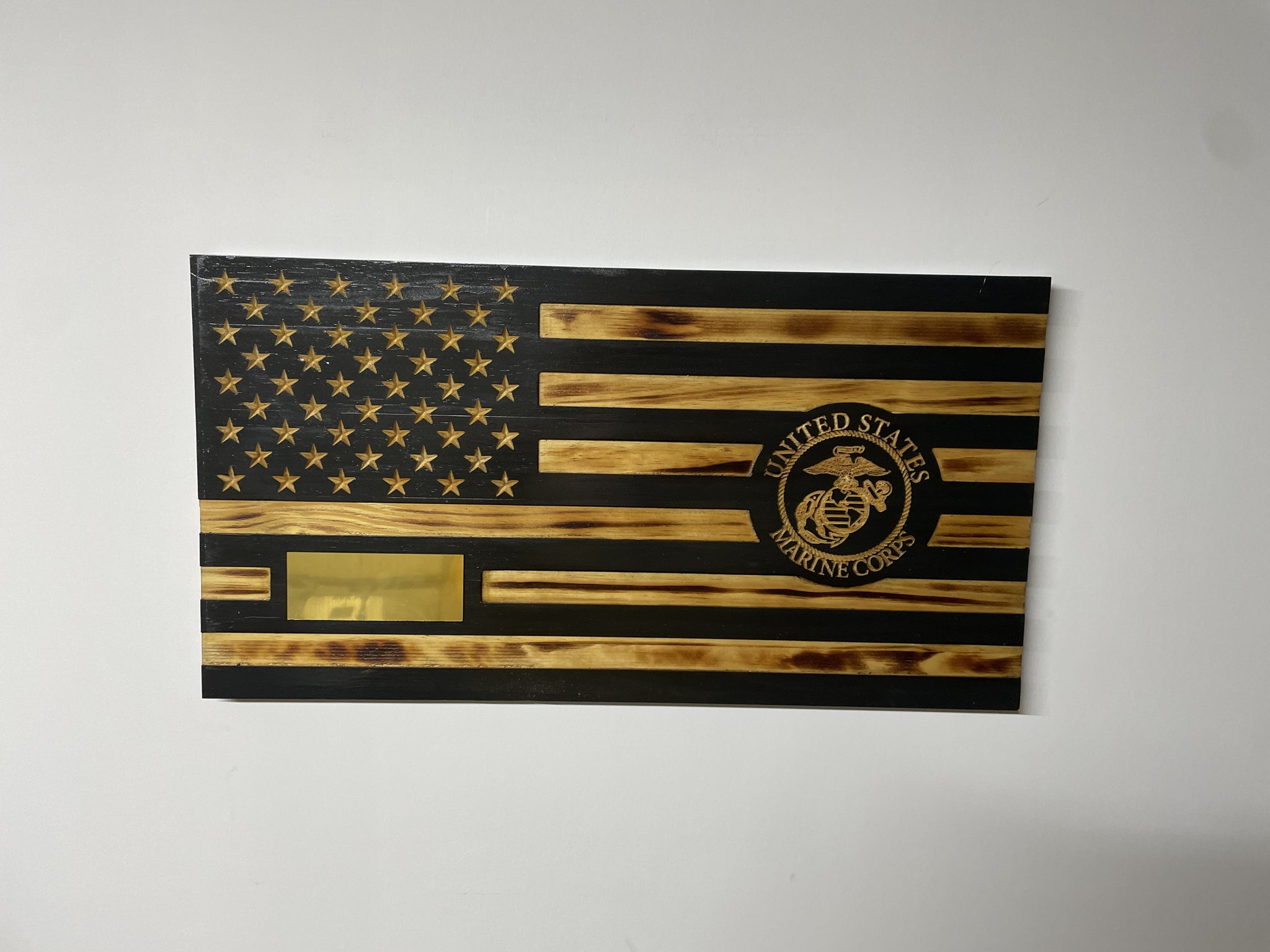 The few, the proud, the Marines! Imagine your decor with a proudly displayed and personally engraved Marine Corps flag on your wall. Vertical slots on rear of the flag, allow it to be hung on the wall with keyway slots routed 16 inches on center for typical framing in the home.